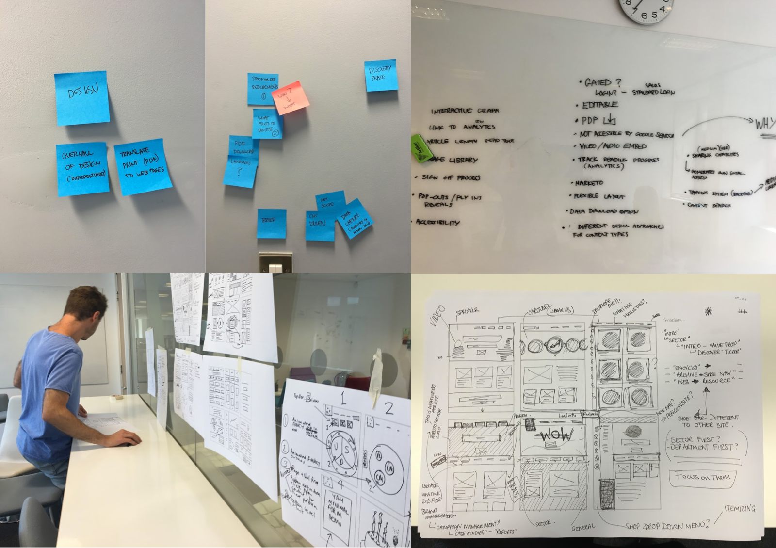 Our initial sketching workshops married the current structure with our newly identified ideas. We used the 6up 1up exercise to explore different patterns, layouts and components. Converging to a handful of strong ideas for our designer to explore further.
